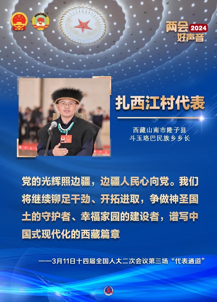 身著珞巴族服飾的西藏山南市隆子縣斗玉珞巴民族鄉(xiāng)鄉(xiāng)長(zhǎng)扎西江村代表走上通道,并帶來(lái)好消息:位于斗玉鄉(xiāng)的珞巴民族歷史文化展覽館即將開(kāi)館。