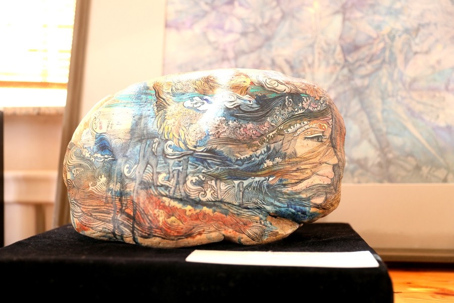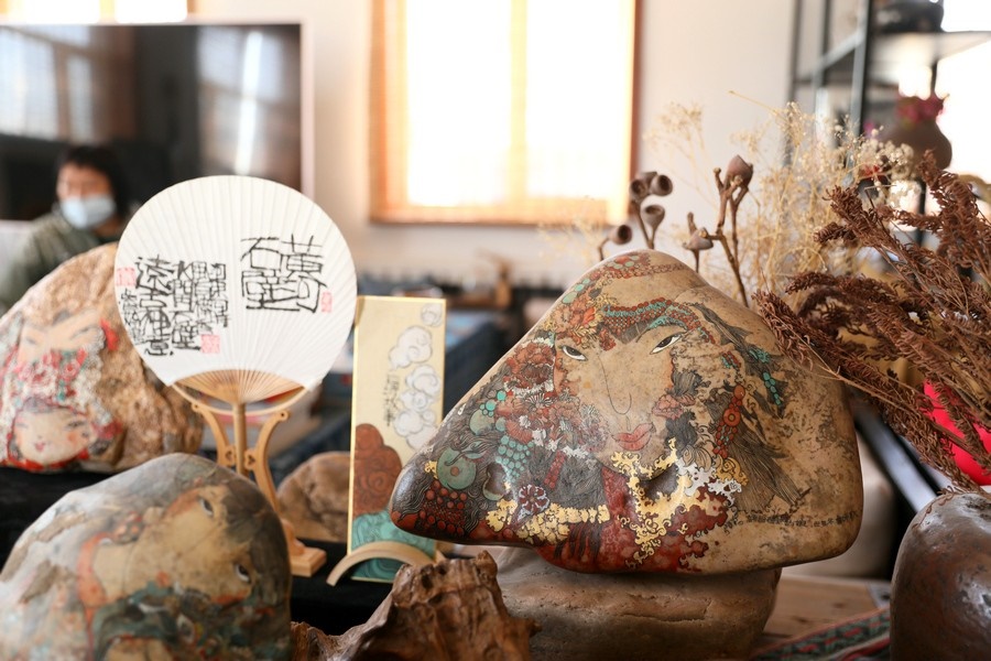 4月27日,內蒙古烏海西行客棧,魯婷在她的黃河石畫工作室,向記者介紹她創(chuàng)作的石畫作品。