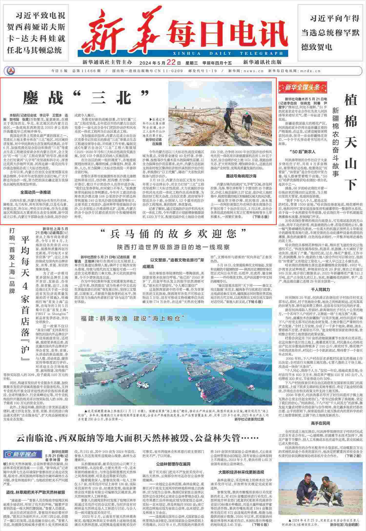 2024年5月22日,《新華每日電訊》頭版頭條刊發(fā)《鏖戰(zhàn)“三北”》,文章報道了我國是世界上荒漠化最嚴重的國家之一,荒漠化土地主要分布在“三北”地區(qū),對區(qū)域經濟發(fā)展,對中華民族的生存發(fā)展構成挑戰(zhàn)。在橫亙于我國西北、華北、東北地區(qū)的內蒙古自治區(qū),一條戰(zhàn)線東西跨度達2000多公里的沙海鏖戰(zhàn)早已吹響沖鋒號。