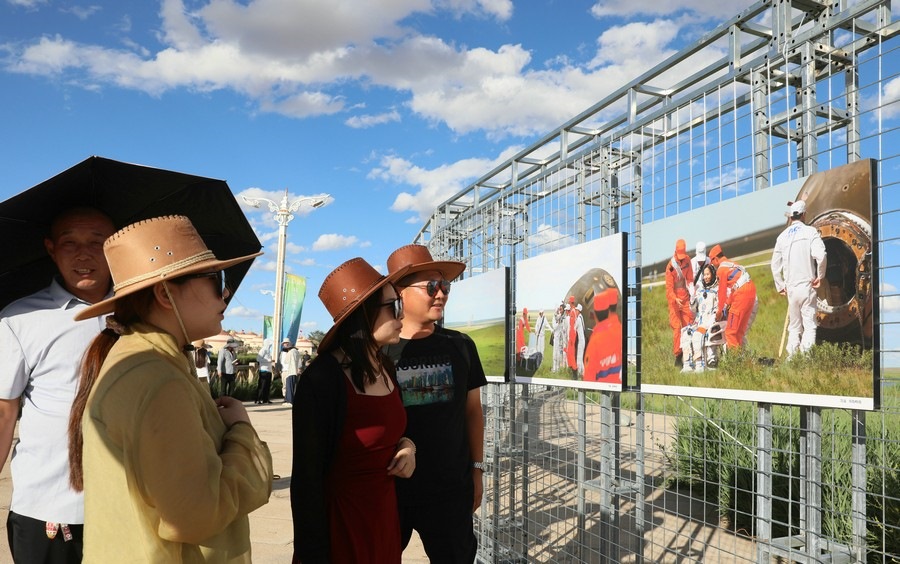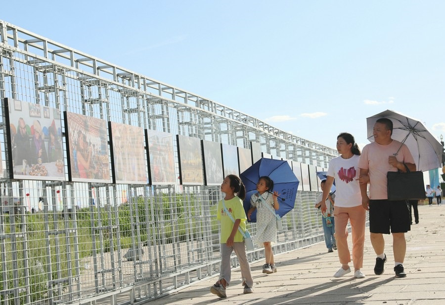 7月28日,第14屆《食色世界》攝影大展,在四子王旗格根塔拉草原旅游中心開展。圖為游客從攝影展前走過。