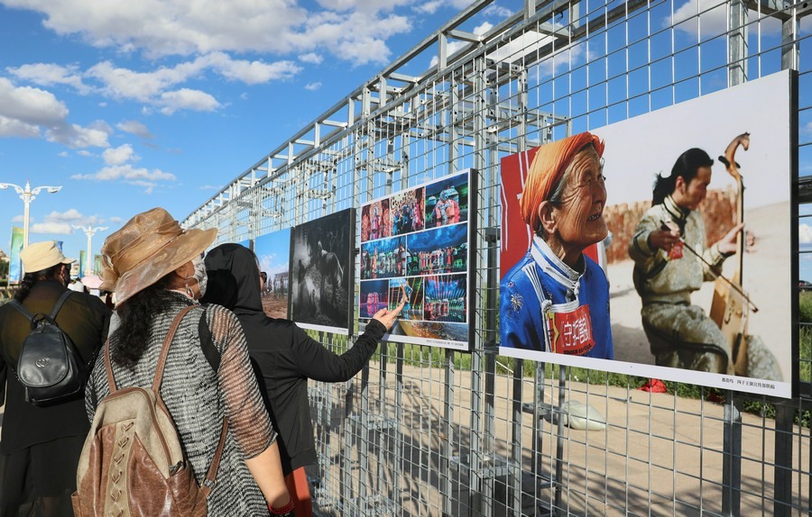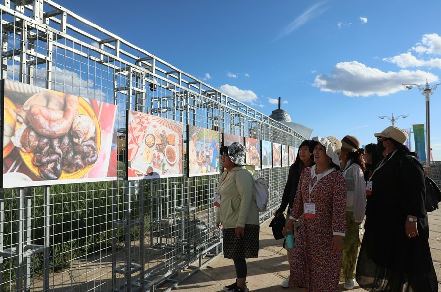 7月28日,第14屆《食色世界》攝影大展,在四子王旗格根塔拉草原旅游中心開展。圖為游客正在參觀攝影展。