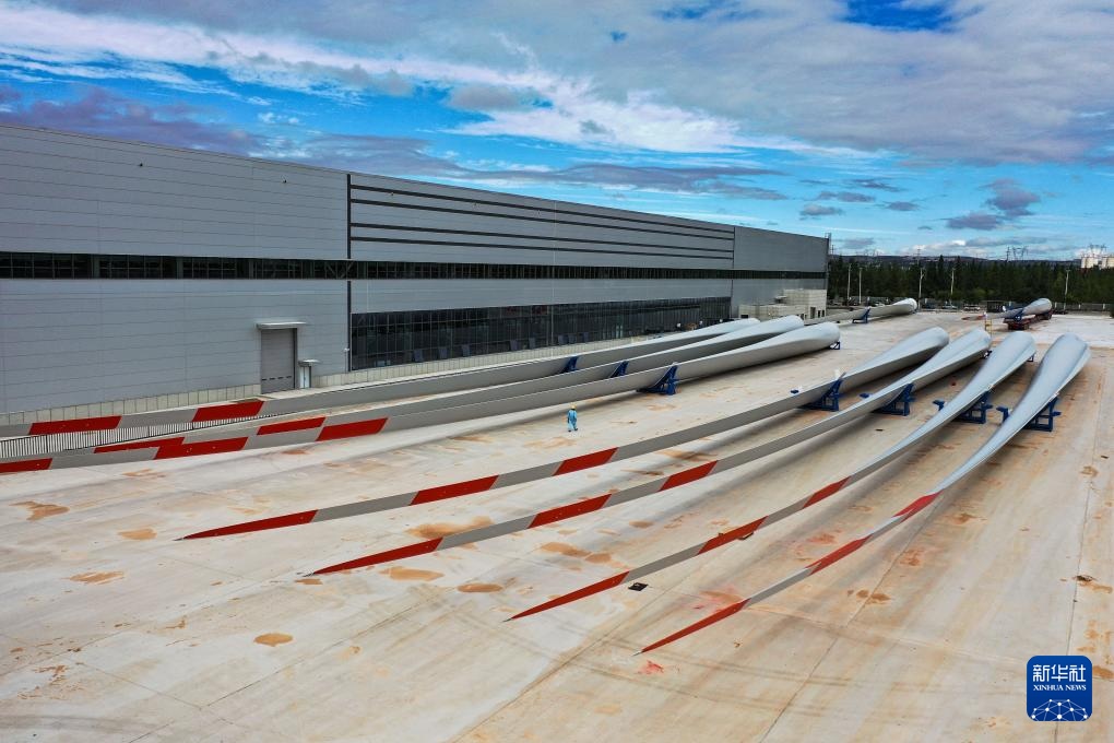 ??這是9月20日拍攝的位于鄂爾多斯市的株洲時代新材料科技股份有限公司蒙西分公司內的風機葉片(無人機照片)。