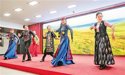 11月12日,烏蘭牧騎隊(duì)員在北京市西城區(qū)德勝街道辦事處與群眾一同跳舞。當(dāng)日,內(nèi)蒙古自治區(qū)直屬烏蘭牧騎攜包頭市達(dá)茂旗烏蘭牧騎、鄂爾多斯市伊金霍洛旗烏蘭牧騎開(kāi)展“紅色文藝輕騎兵 烏蘭牧騎在北京”——北疆文化神州行文藝演出活動(dòng)。據(jù)了解,此次烏蘭牧騎進(jìn)京演出活動(dòng),從11月6日至17日,在北京的民族文化宮為觀眾奉獻(xiàn)33場(chǎng)精彩的演出,同時(shí)還將走進(jìn)社區(qū)和學(xué)校開(kāi)展多場(chǎng)演出活動(dòng)。 (記者 王磊 攝)