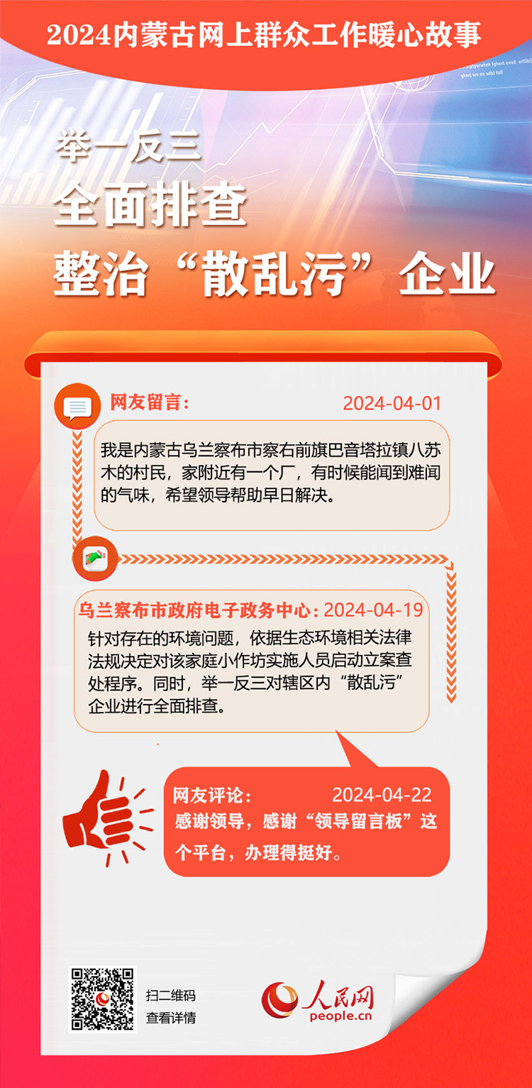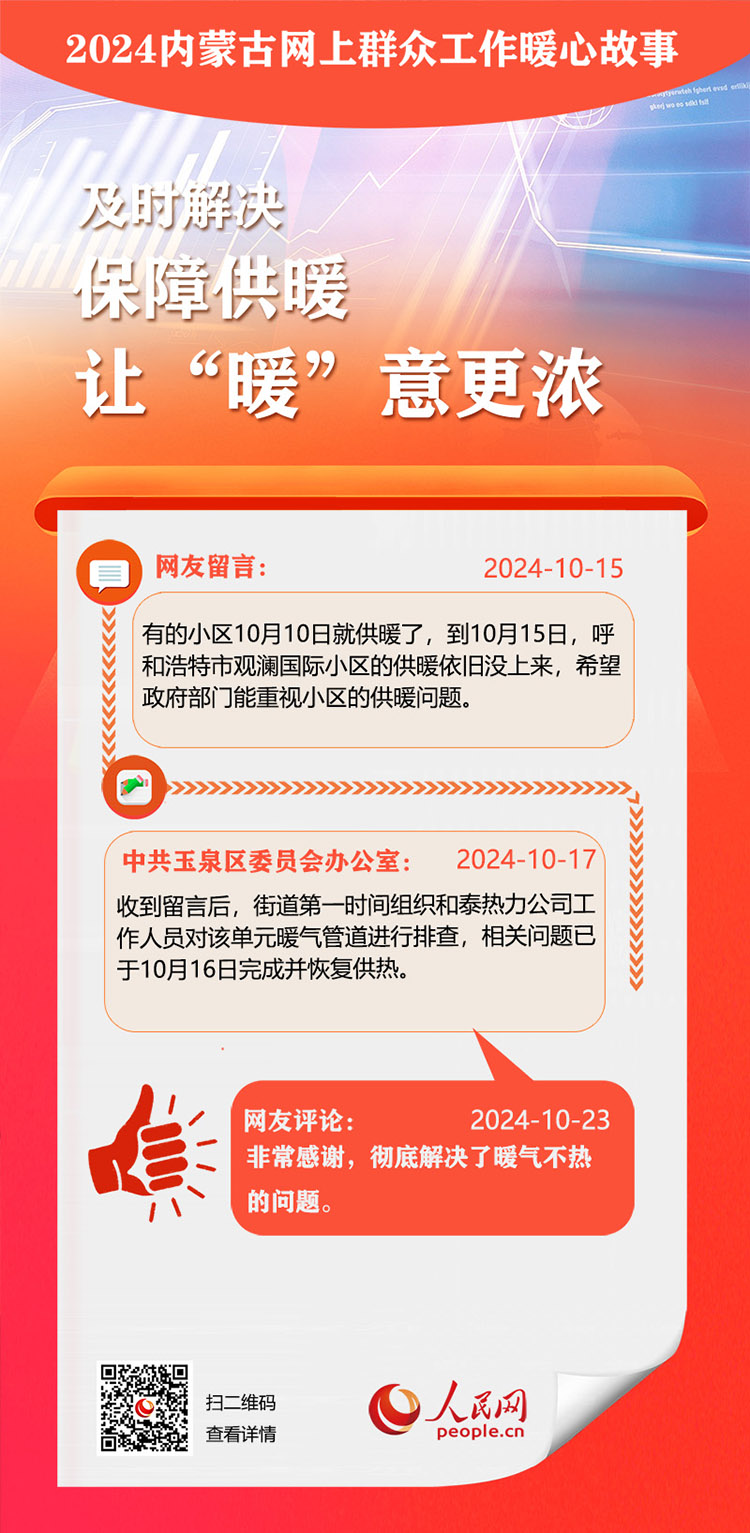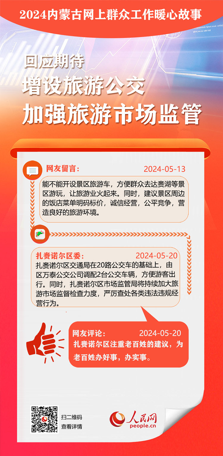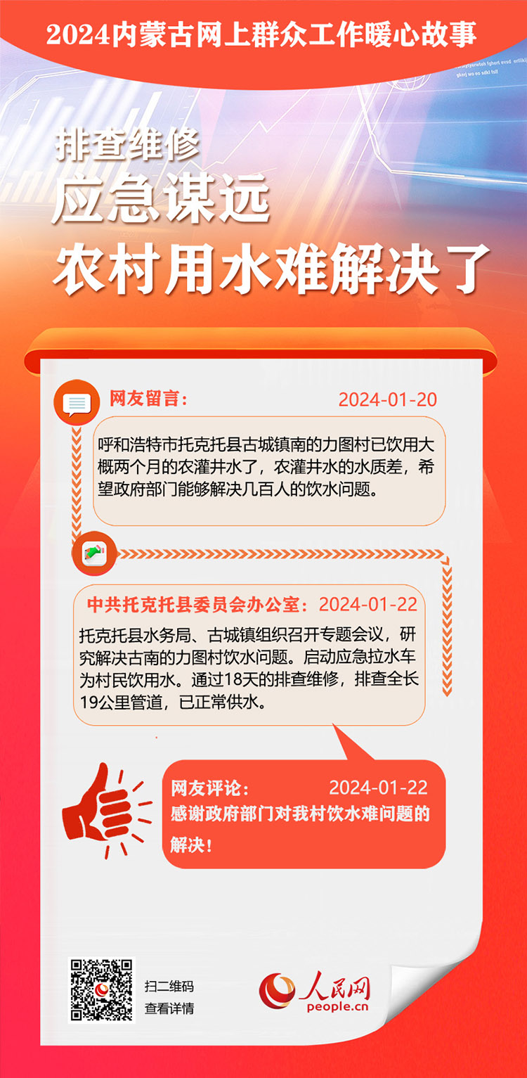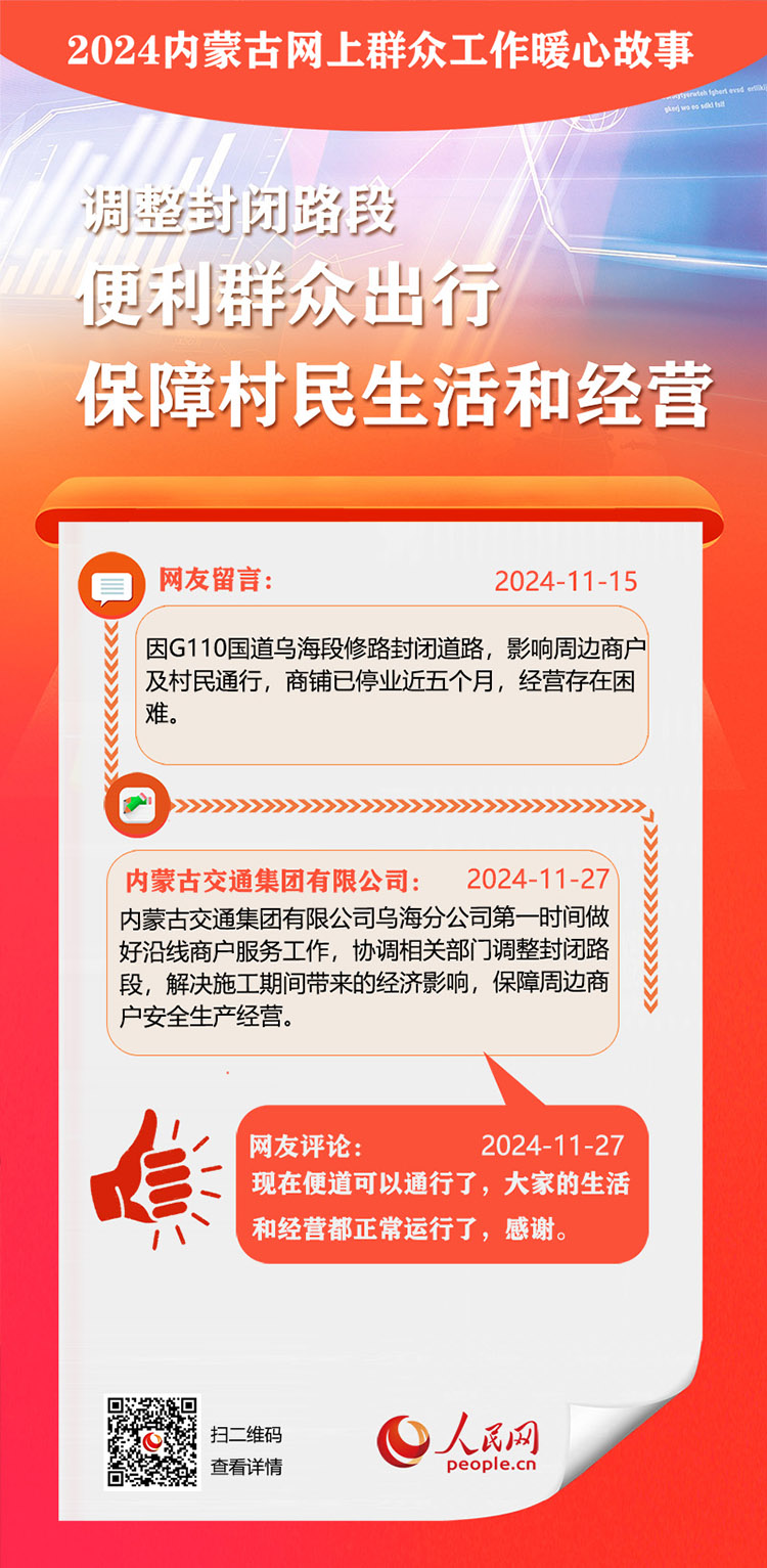 走好走實網(wǎng)上群眾路線 用心用情為民服務辦實事。依托人民網(wǎng)“領導留言板”,內(nèi)蒙古自治區(qū)各級黨委、政府著力解決網(wǎng)民反映的熱點難點。2024年,一批群眾關(guān)切的急難愁盼問題得到及時解決。人民網(wǎng)內(nèi)蒙古頻道推出特別策劃,盤點過去一年內(nèi)蒙古網(wǎng)上群眾工作那些暖心事?!?/p>