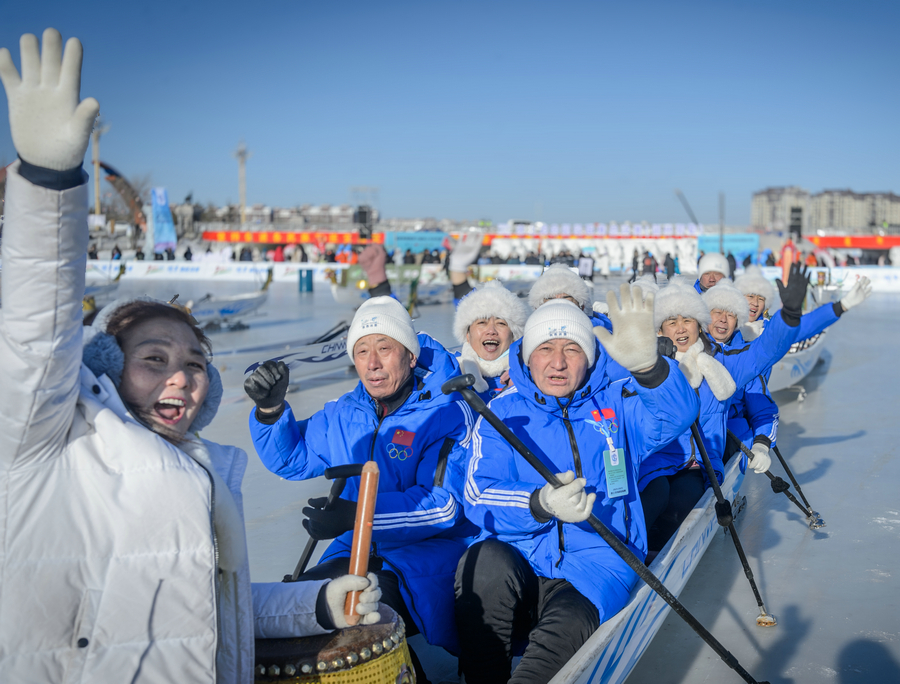 冰上龍舟作為傳統(tǒng)龍舟運(yùn)動(dòng)的創(chuàng)新變體,將場(chǎng)地移至冰面,船體保留了龍舟的基本構(gòu)造元素,同時(shí)底部裝有冰刀或滑輪以適應(yīng)冰面滑行。這項(xiàng)運(yùn)動(dòng)融合了競(jìng)技性、團(tuán)隊(duì)性與娛樂(lè)性,讓參與者在冰面上體驗(yàn)風(fēng)馳電掣的刺激,能夠極大地激發(fā)了人們的冰雪運(yùn)動(dòng)熱情。
