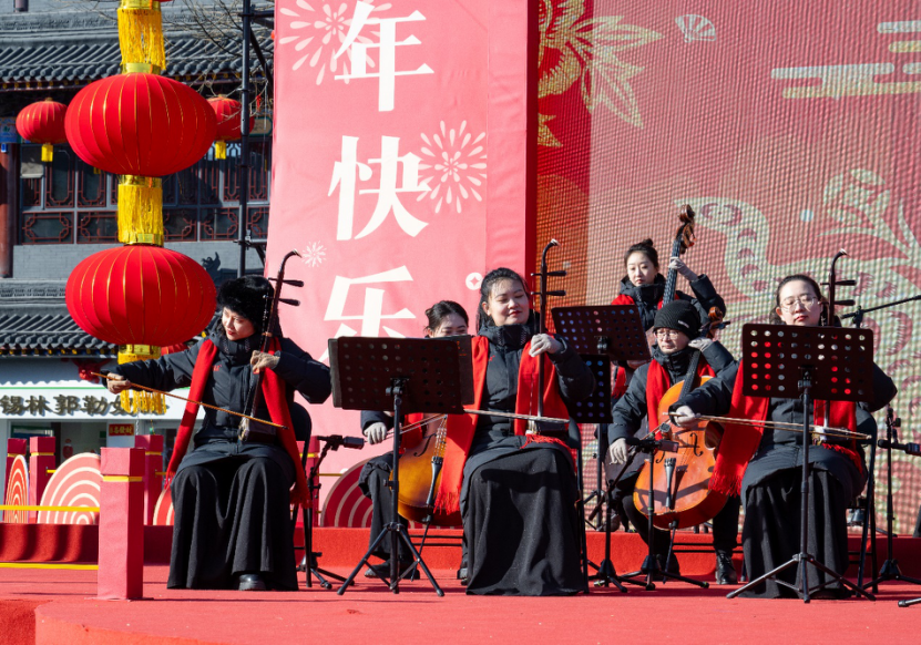 2月12日上午,在呼和浩特大召廣場(chǎng)上,“新民樂”音樂會(huì)精彩上演,傳統(tǒng)民樂與現(xiàn)代音樂交織融合,為觀眾帶來一場(chǎng)別具一格的聽覺盛宴。