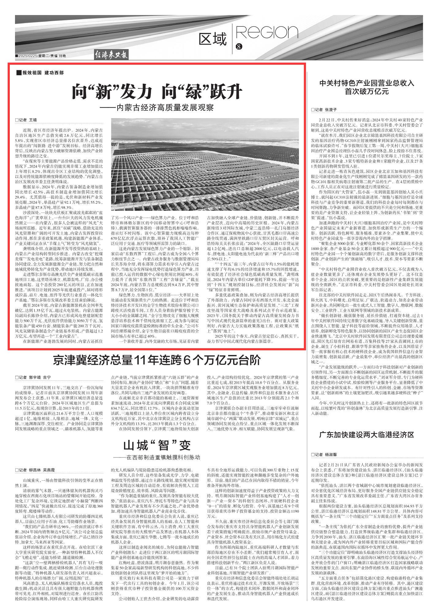 2025年2月25日《經(jīng)濟參考報》第8版刊發(fā)了《向“新”發(fā)力 向“綠”躍升——內(nèi)蒙古經(jīng)濟高質(zhì)量發(fā)展觀察》的文章,報道了多重優(yōu)惠政策疊加,為內(nèi)蒙古經(jīng)濟高增長提供了外部助力,經(jīng)濟社會發(fā)展向“新”向“綠”特征非常鮮明,讓政策從“紙上”落到“地上”。
