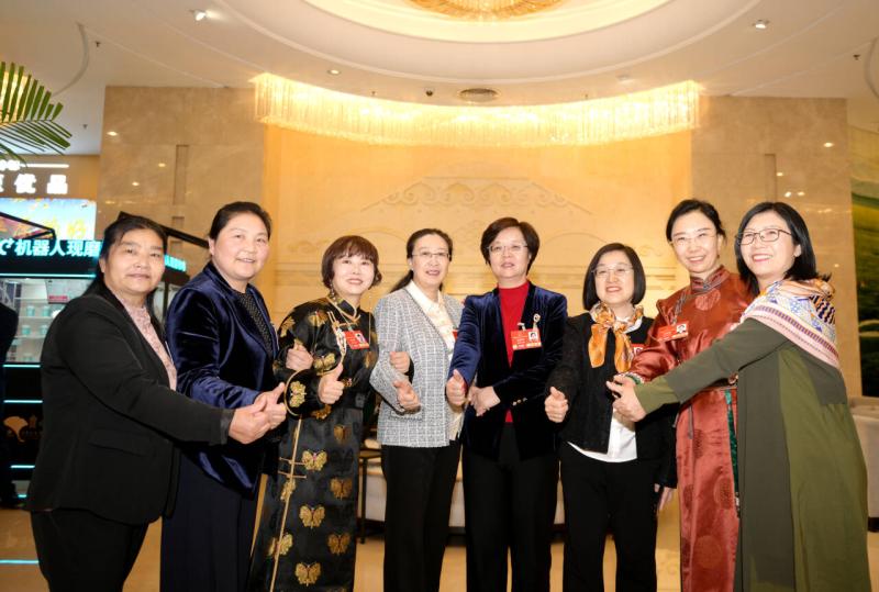3月7日,參加十四屆全國(guó)人大三次會(huì)議的內(nèi)蒙古代表團(tuán)的部分女代表們?cè)隈v地合影,迎接即將到來(lái)的三八婦女節(jié),表達(dá)了對(duì)全國(guó)女性的美好祝愿。記者 馬建兵 攝