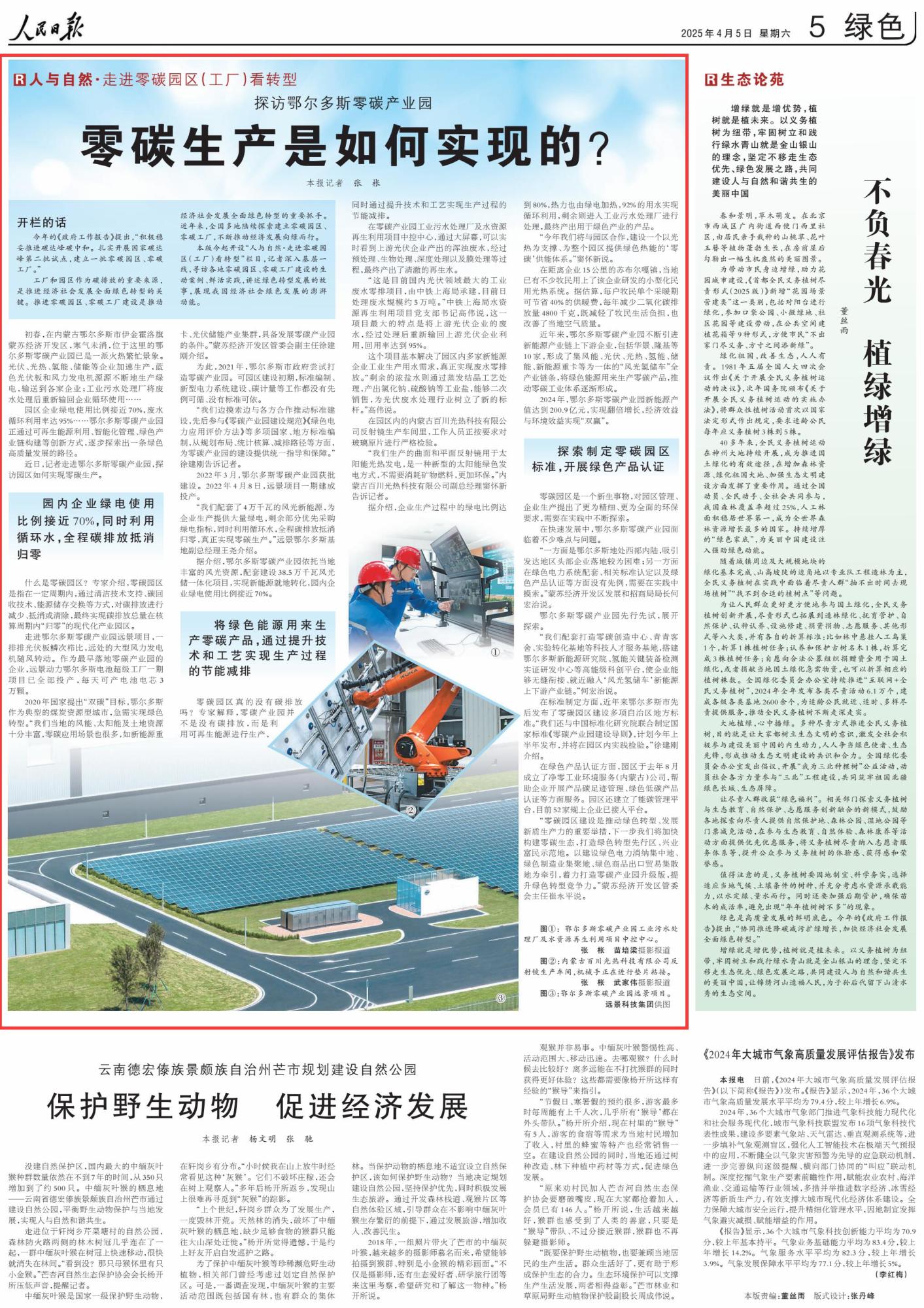 2025年4月5日,《人民日報》第5版刊發(fā)題為《探訪鄂爾多斯零碳產(chǎn)業(yè)園 零碳生產(chǎn)是如何實現(xiàn)的?》的文章,報道了鄂爾多斯零碳產(chǎn)業(yè)園通過可再生能源利用、智能化管理、綠色產(chǎn)業(yè)鏈構(gòu)建等創(chuàng)新方式,逐步探索出一條綠色高質(zhì)量發(fā)展的路徑。