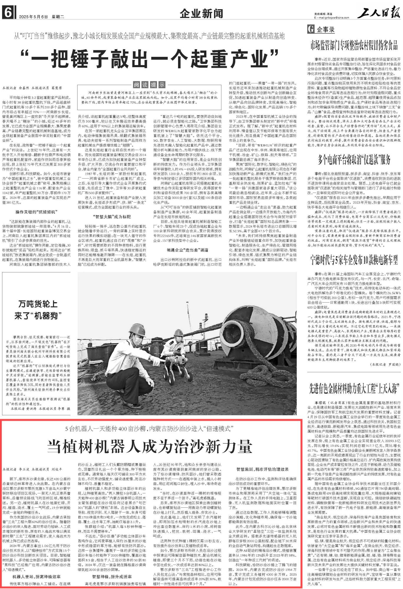 2025年5月6日,《工人日報》第6版刊發(fā)題為《當植樹機器人成為治沙新力量》的文章,報道了內(nèi)蒙古作為我國防沙治沙主戰(zhàn)場,承擔著“三北”工程六期60%的治沙任務(wù)。隨著防沙治沙的深入推進,智能植樹機器人、多功能立體固沙車、可降解容器等“黑科技”已經(jīng)推廣應(yīng)用,內(nèi)蒙古防沙治沙進入“倍速模式”。