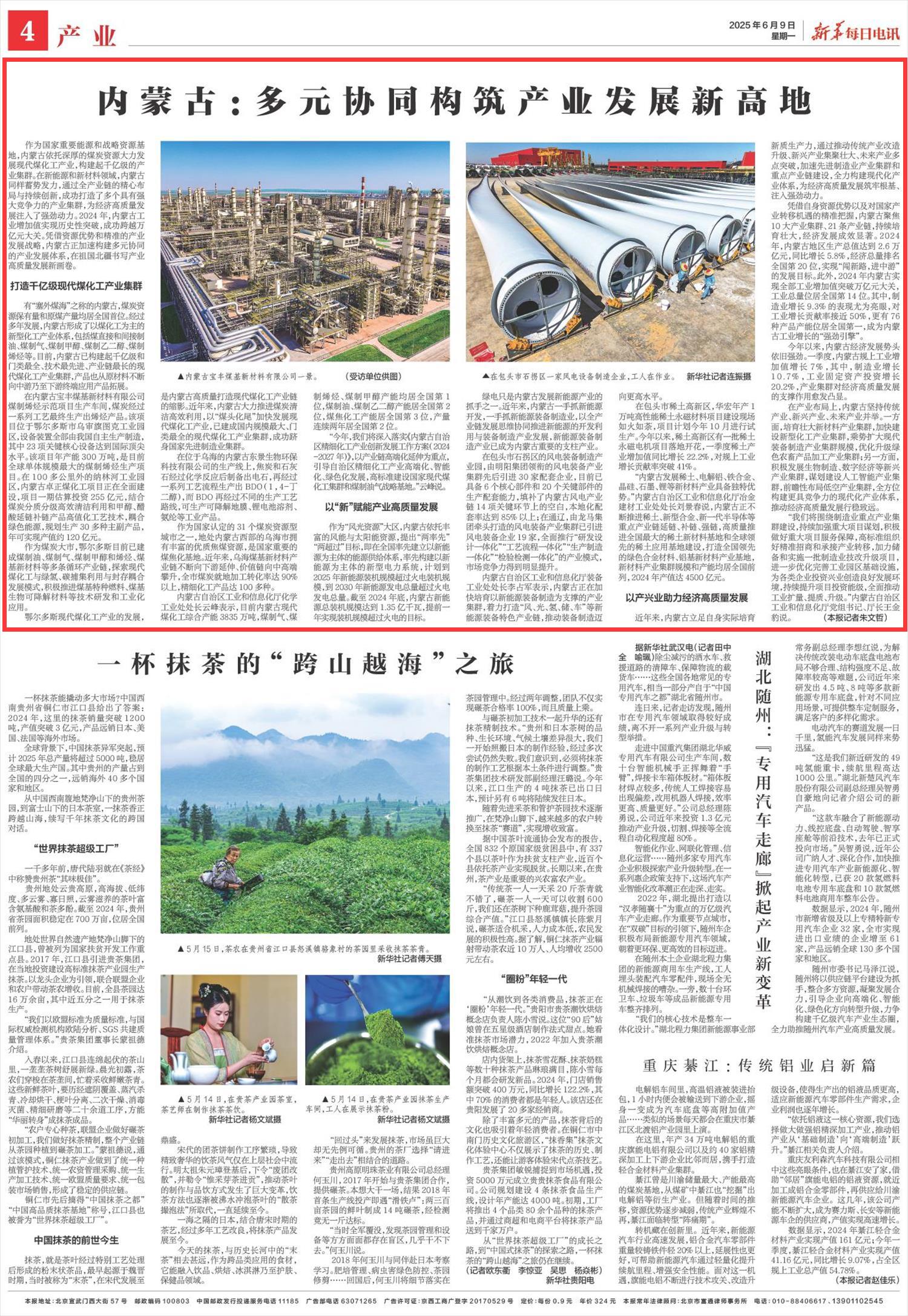 2025年6月9日《新華每日電訊》第4版刊發(fā)了《內(nèi)蒙古:多元協(xié)同構(gòu)筑產(chǎn)業(yè)發(fā)展新高地》的文章,報(bào)道了內(nèi)蒙古依托深厚的煤炭資源大力發(fā)展現(xiàn)代煤化工產(chǎn)業(yè),構(gòu)建起千億級(jí)的產(chǎn)業(yè)集群。憑借資源優(yōu)勢(shì)和精準(zhǔn)的產(chǎn)業(yè)發(fā)展戰(zhàn)略,內(nèi)蒙古正加速構(gòu)建多元協(xié)同的產(chǎn)業(yè)發(fā)展體系,在祖國(guó)北疆書(shū)寫(xiě)產(chǎn)業(yè)高質(zhì)量發(fā)展新畫(huà)卷。