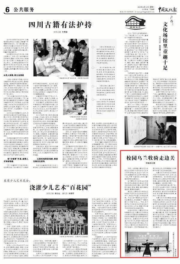 2025年6月11日,《中國文化報》第6版刊發(fā)題為《校園烏蘭牧騎走邊關(guān)》的文章,報道了內(nèi)蒙古藝術(shù)學(xué)院烏蘭牧騎藝術(shù)團(tuán)師生來到烏拉特中旗邊防一線,開展慰問演出,歌曲、舞蹈、器樂演奏輪番登場,贏得陣陣掌聲。