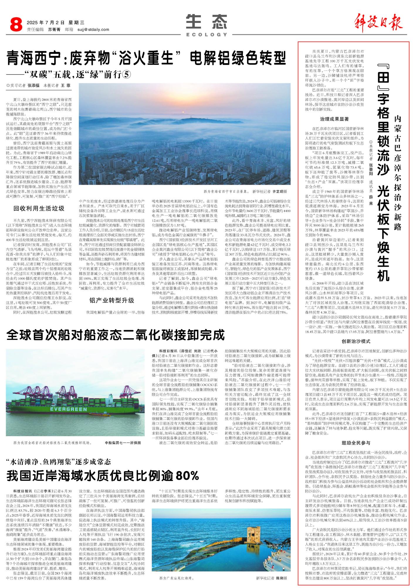 2025年7月2日《科技日報》第8版刊發(fā)了《內蒙古巴彥淖爾探治沙新路“田”字格里鎖流沙 光伏板下煥生機》的文章,報道了內蒙古巴彥淖爾市將“三北”工程攻堅戰(zhàn)打成一場全民戰(zhàn)役,政府、企業(yè)、社會組織和廣大農牧民齊心協(xié)力,共同防沙治沙。因地制宜,創(chuàng)新出多種治沙模式,為沙漠帶來了新的生機與活力。