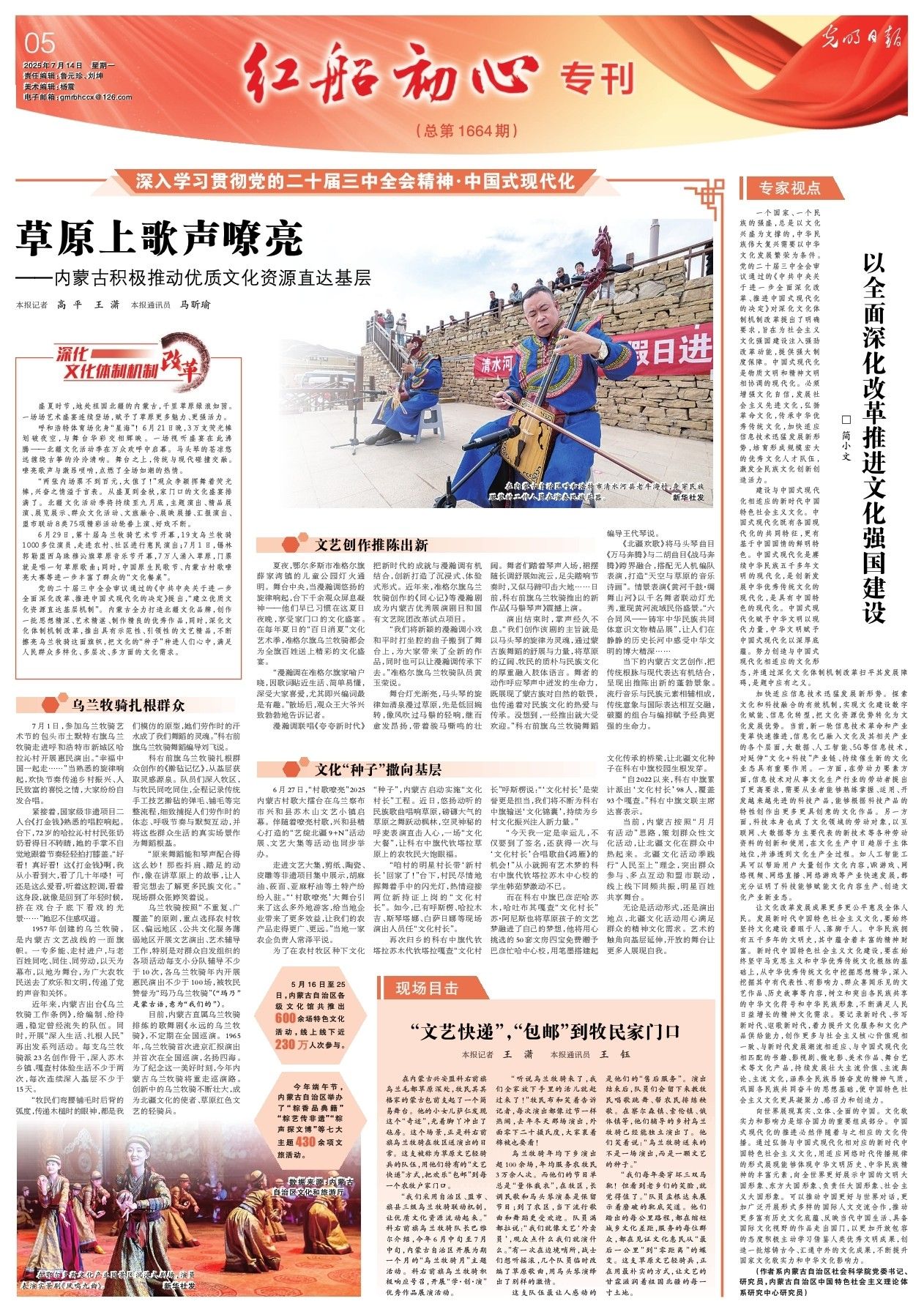 2025年7月14日,《光明日報》第5版刊發(fā)題為《草原上歌聲嘹亮——內蒙古積極推動優(yōu)質文化資源直達基層》的文章,報道了盛夏時節(jié),地處祖國北疆的內蒙古,千里草原綠浪如茵。一場場藝術盛宴連續(xù)登場,賦予了草原更多魅力、更強活力。