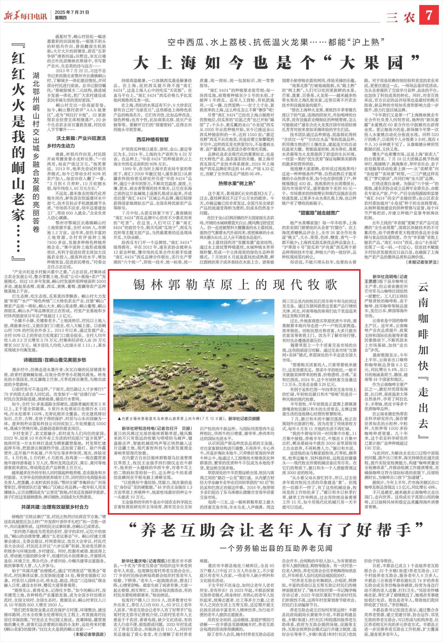 2025年7月31日,《新華每日電訊》第7版刊發(fā)題為《錫林郭勒草原上的現(xiàn)代牧歌》的文章,報(bào)道了夏日的風(fēng)拂過(guò)無(wú)垠的錫林郭勒草原,隨風(fēng)飄來(lái)的不只有悠遠(yuǎn)的牧歌與嗒嗒的馬蹄聲,鍵盤(pán)敲擊聲、智能機(jī)械低鳴聲等正悄然融入這片邊疆土地,現(xiàn)代畜牧科技與全新發(fā)展理念奏響草原現(xiàn)代牧歌。