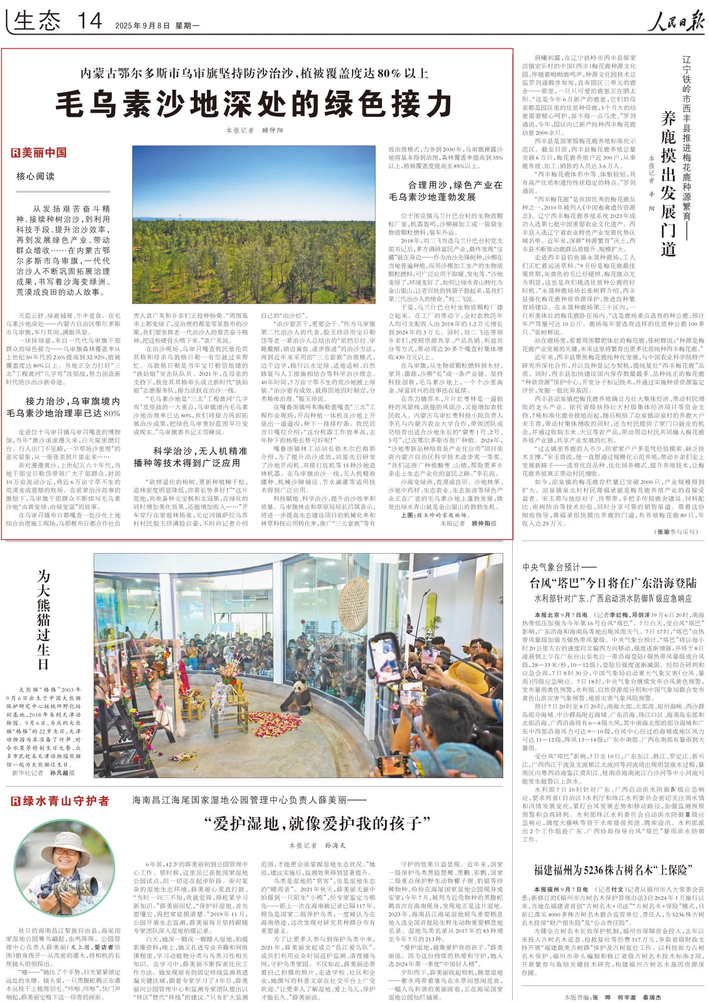 2025年9月8日《人民日報》第14版刊發(fā)了《內(nèi)蒙古鄂爾多斯市烏審旗堅持防沙治沙,植被覆蓋度達(dá)80%以上 毛烏素沙地深處的綠色接力》的文章,報道了在內(nèi)蒙古鄂爾多斯市烏審旗,一代代治沙人不斷鞏固拓展治理成果,書寫著沙海變綠洲、荒漠成良田的動人故事。沙地林果、沙地中藥材、生態(tài)農(nóng)業(yè)、生態(tài)旅游等綠色產(chǎn)業(yè)正在廣袤的毛烏素沙地上蓬勃發(fā)展,煥發(fā)出綠水青山就是金山銀山的勃勃生機(jī)。