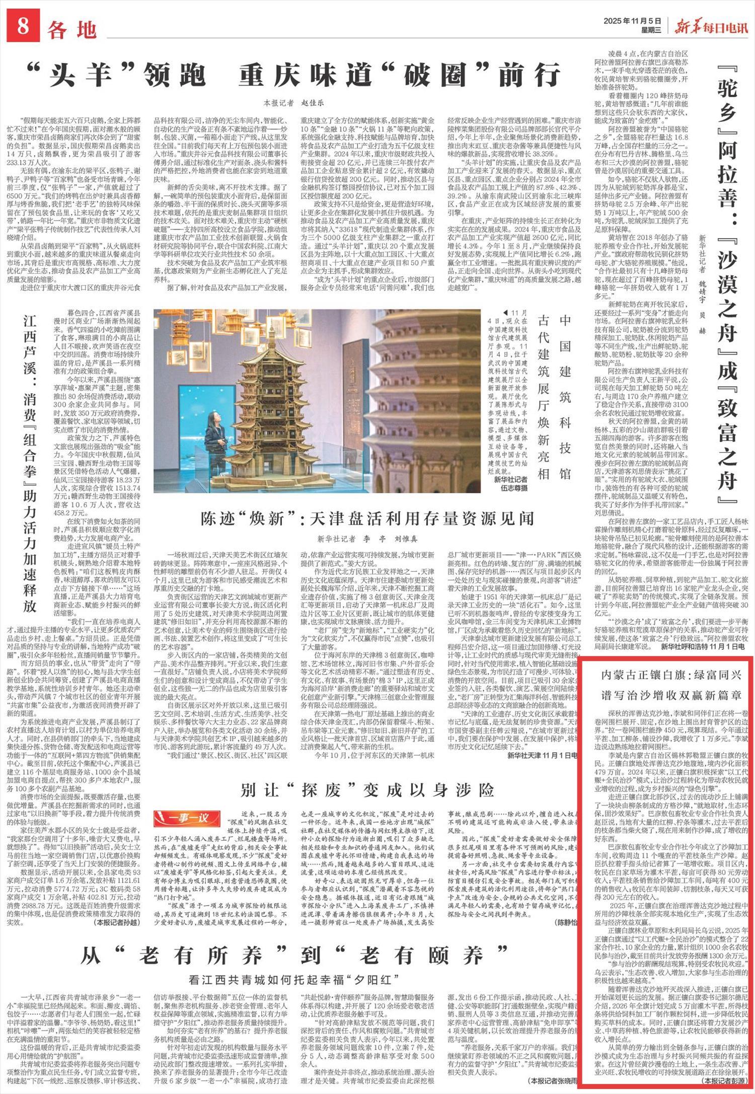 2025年11月5日,《新華每日電訊》第8版刊發(fā)題為《內(nèi)蒙古正鑲白旗:綠富同興譜寫(xiě)治沙增收雙贏新篇章》的文章,報(bào)道了2024年以來(lái),內(nèi)蒙古正鑲白旗積極探索“以工代賑+全民治沙”模式,讓治沙過(guò)程轉(zhuǎn)化為帶動(dòng)農(nóng)牧民就業(yè)增收的過(guò)程,成為鄉(xiāng)村振興的“綠色引擎”。