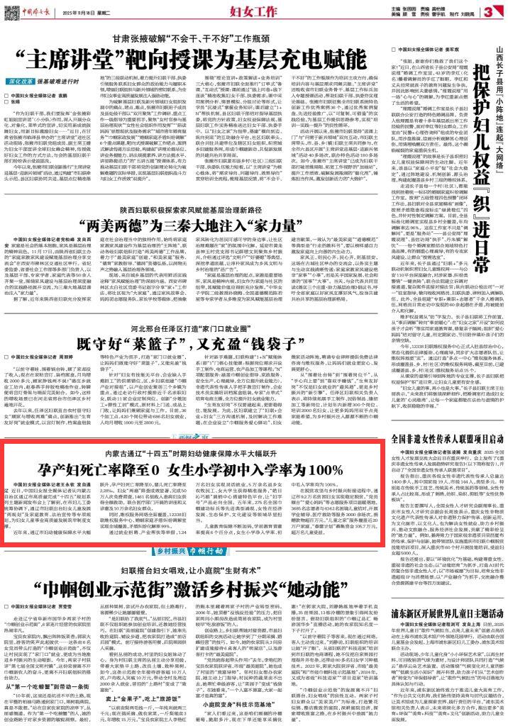 2025年11月18日《中國(guó)婦女報(bào)》第3版刊發(fā)了《內(nèi)蒙古通遼“十四五”時(shí)期婦幼健康保障水平大幅躍升 孕產(chǎn)婦死亡率降至0 女生小學(xué)初中入學(xué)率為100%》的文章,報(bào)道了近年來,通遼市婦幼健康保障水平大幅躍升,孕產(chǎn)婦死亡率降至0,嬰兒死亡率降至2.28‰。婦女“兩癌”篩查成效顯著,完成50萬人次免費(fèi)篩查,1461名低收入患病婦女獲得全額救助。聯(lián)合醫(yī)療部門開展的講座和義診惠及10萬余名婦女群眾。