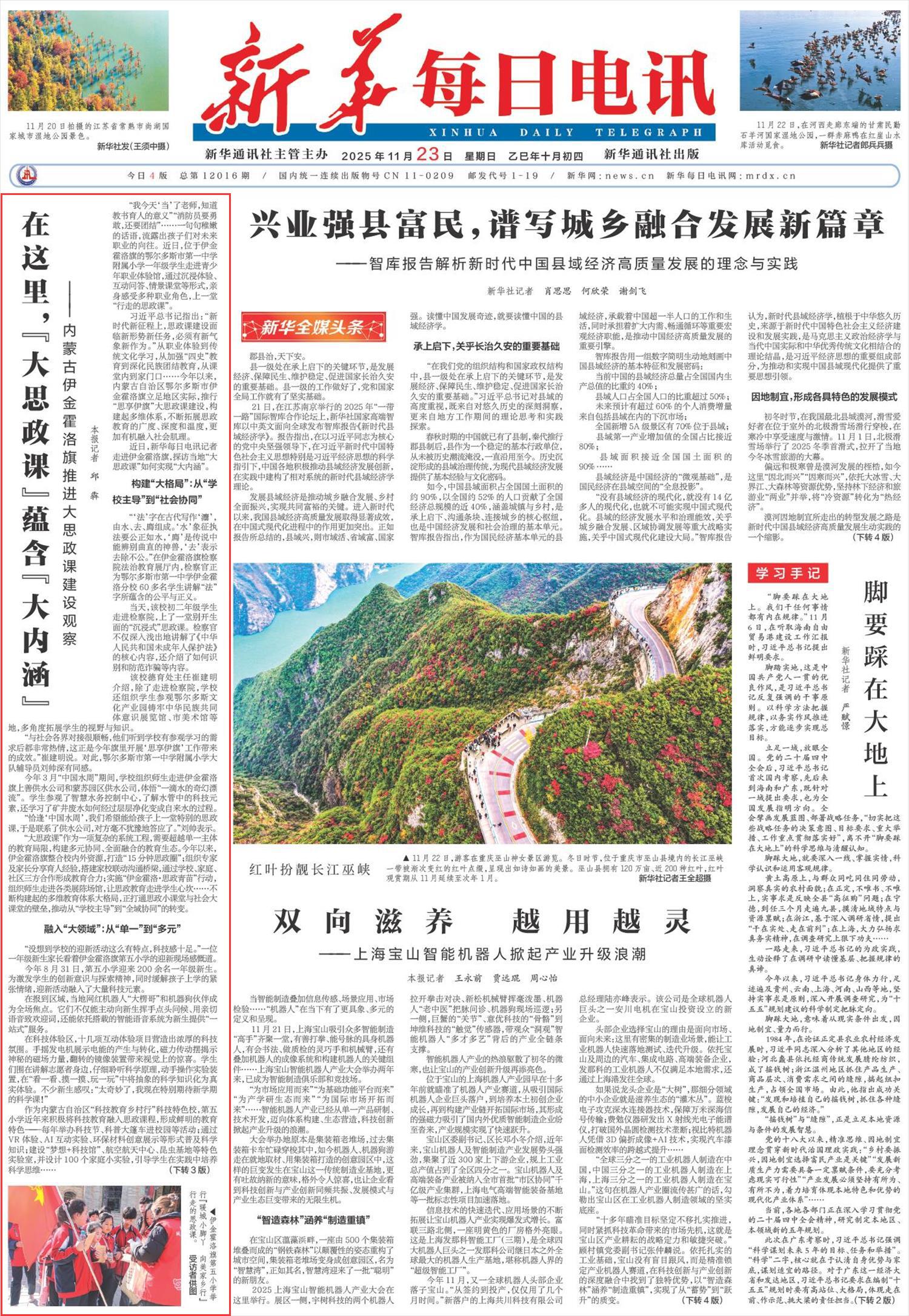 2025年11月23日,《新華每日電訊》頭版刊發(fā)題為《在這里,“大思政課”蘊含“大內(nèi)涵”——內(nèi)蒙古伊金霍洛旗推進大思政課建設觀察》的文章,報道了內(nèi)蒙古自治區(qū)鄂爾多斯市伊金霍洛旗立足地區(qū)實際,推行“思享伊旗”大思政課建設,構建起多維體系,不斷拓展思政教育的廣度、深度和溫度,更加有機融入社會肌理。