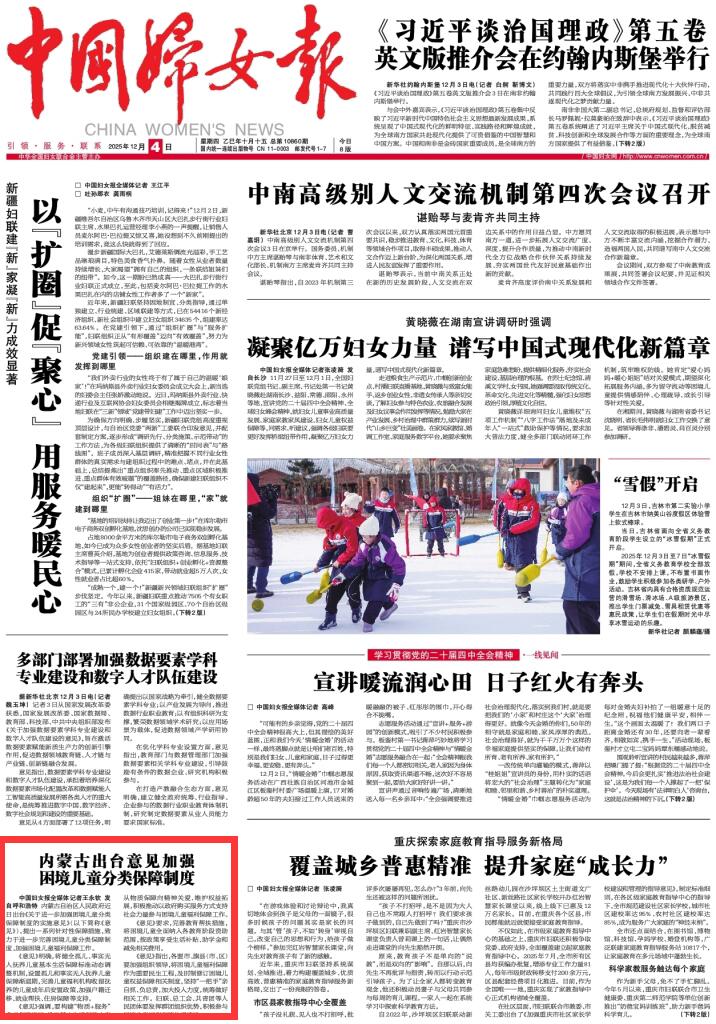 2025年12月4日《中國婦女報》第1版刊發(fā)了《內(nèi)蒙古出臺意見加強困境兒童分類保障制度》的文章,報道了內(nèi)蒙古自治區(qū)人民政府近日出臺《關(guān)于進一步加強困境兒童分類保障制度的實施意見》,提出一系列針對性保障措施,致力于進一步完善困境兒童分類保障制度,加強困境兒童福利保障工作。