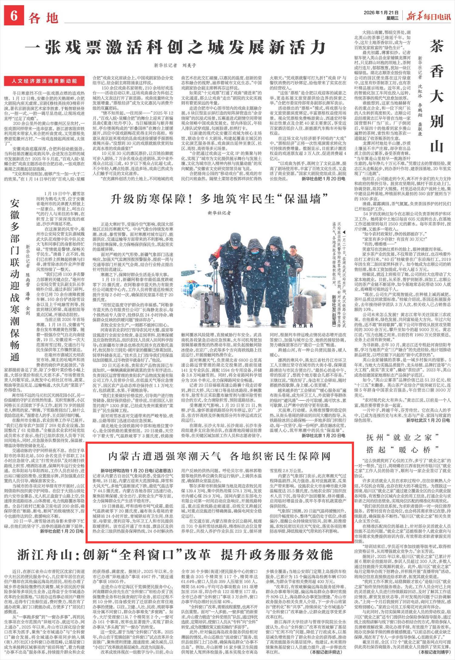 2026年1月21日《新華每日電訊》第6版刊發(fā)了《內(nèi)蒙古遭遇強(qiáng)寒潮天氣 各地織密民生保障網(wǎng)》的文章,報(bào)道了內(nèi)蒙古迎來(lái)大范圍降溫、降雪和大風(fēng)天氣,多地氣溫?cái)嘌率较碌畹蜌鉁剡_(dá)零下44.5攝氏度。各地各部門迅速行動(dòng),聚焦防寒保暖、安全出行、農(nóng)牧業(yè)生產(chǎn)等方面,全力保障群眾生產(chǎn)生活平穩(wěn)有序。