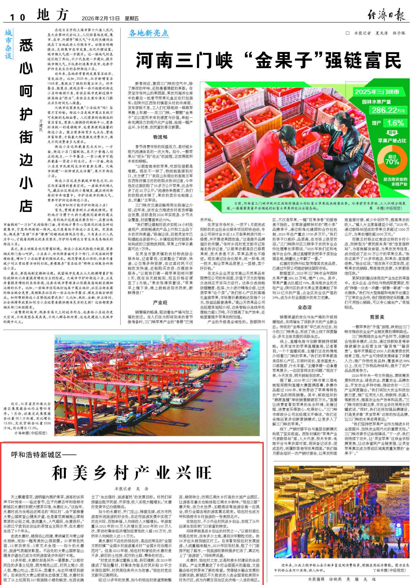 2026年2月13日《經(jīng)濟(jì)日報》第10版刊發(fā)了《呼和浩特新城區(qū)——和美鄉(xiāng)村產(chǎn)業(yè)興旺》的文章,報道了內(nèi)蒙古呼和浩特市新城區(qū)水磨村、惱包村之變,是和美鄉(xiāng)村建設(shè)的生動實踐。新城區(qū)成功入選全國首批美麗鄉(xiāng)村先行區(qū),成為內(nèi)蒙古自治區(qū)此次唯一入選的地區(qū)。產(chǎn)業(yè)發(fā)展奠定了鄉(xiāng)村全面振興的基礎(chǔ),文旅融合給村民帶來了新的希望。