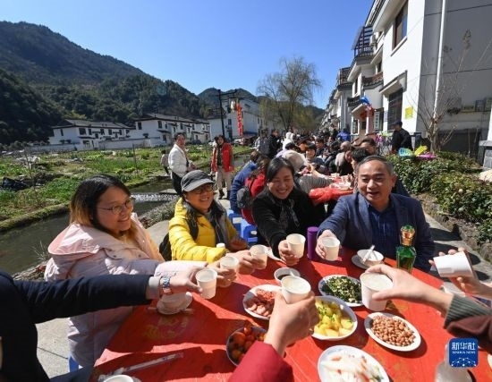 2月26日,游客們在蓮花鎮(zhèn)戴家新村的百家宴上品嘗特色美食。