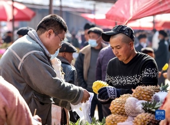 2月26日,在托克扎克鎮(zhèn)農(nóng)貿(mào)市場,顧客在購買菠蘿。