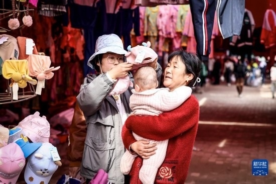 2月26日,在托克扎克鎮(zhèn)農(nóng)貿(mào)市場,一名女士在給孩子挑選帽子。