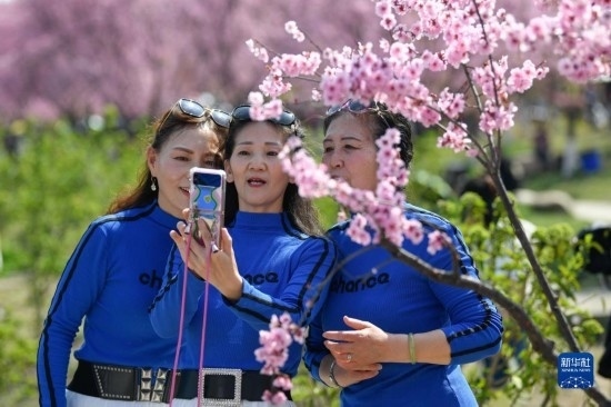 3月8日,游人在都江堰市青城山鎮(zhèn)“問(wèn)花村”自拍。