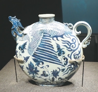 一件精美的青花鳳首扁壺引人注目。此壺出土于北京舊鼓樓大街豁口以東一處元代院落遺址。壺身為扁圓形,以鳳首為流,鳳尾作柄,用青料在壺身上繪出展翅飛翔的鳳鳥,器形與紋飾渾然一體,構(gòu)思精絕?!斑@是首都博物館收藏的國家一級文物。”章文永說,“青花瓷體現(xiàn)了元代承接唐宋并對不同文化兼容并蓄的時(shí)代氣象,元大都正是在這種氛圍中誕生的偉大杰作?!?/P>
