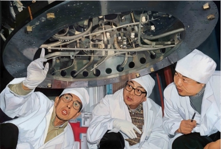 布面油畫《知難而進 眾志成城》原型為新華社記者王呈選拍攝的一幅新聞照片,畫面為20世紀80年代末清華大學核能與新能源技術研究院王大中、馬昌文、董鐸正在進行5兆瓦低溫核反應堆調(diào)試的場景。作品生動地刻畫了以國家最高科學技術獎獲得者王大中院士等為代表的清華教師勇于承擔國家重大科技項目,知難而進、眾志成城的寶貴精神。
