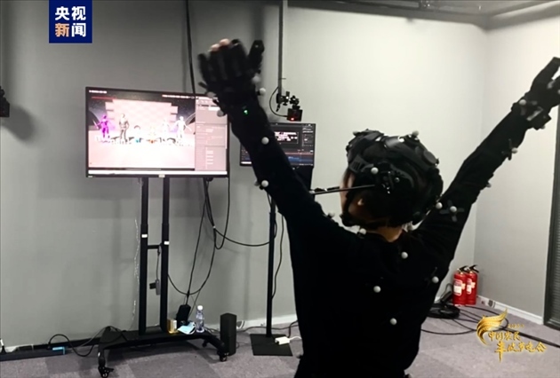 5月4日,游客在新昌穿巖十九峰景區(qū)夜游項目“山海經(jīng)奇”中體驗燈光剪影。