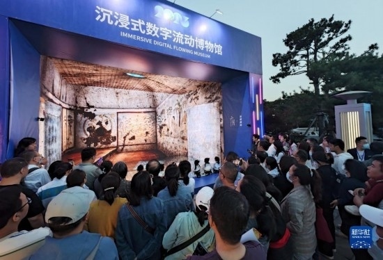 5月22日晚,在2023陜西“博物館與美好生活”文博之夜活動上,游客參觀沉浸式數字流動博物館。