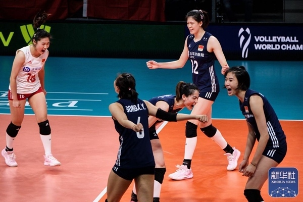 中國隊球員在比賽中慶祝得分。2022年9月28日,在荷蘭阿納姆舉行的2022世界女排錦標賽第一階段D組小組賽中,中國隊3:0戰(zhàn)勝日本隊。新華社記者 孟鼎博 攝