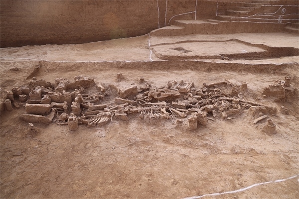 在“郭城”東南拐角處,發(fā)現(xiàn)一條殷墟時期的大型祭祀溝,長達(dá)19.36米,溝內(nèi)堆疊了3層人骨及動物骨骼,初步清理出完整的人骨3具,以及肢解的牛骨、豬骨、馬骨、鳥骨等,經(jīng)動物考古學(xué)家辨認(rèn)至少分屬17個動物個體??脊趴碧竭€發(fā)現(xiàn)不同時期的道路遺跡穿過城壕,為探討洹北商城內(nèi)外部交通路網(wǎng)提供了重要線索。