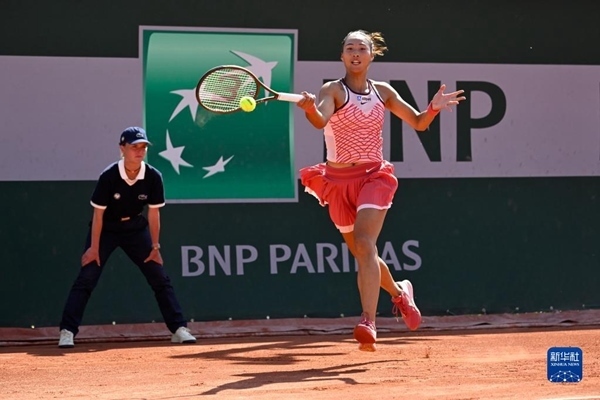 5月28日,鄭欽文在比賽中回球。當日,在2023法國網球公開賽女子單打首輪比賽中,中國選手鄭欽文以2比0戰(zhàn)勝斯洛文尼亞選手齊丹塞克,晉級第二輪。新華社發(fā)(朱利安·馬蒂亞攝)
