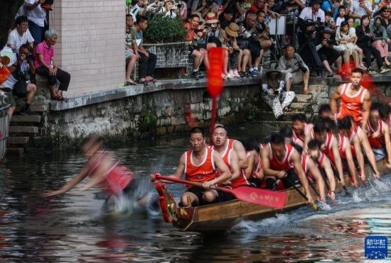 龍船漂移時,船頭船尾的舵手專門負責(zé)入彎出彎時的線路和速度控制(6月22日攝)。