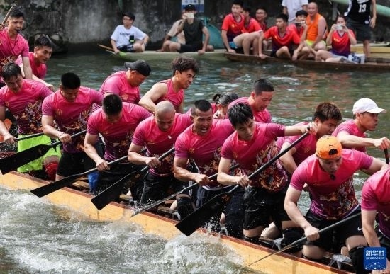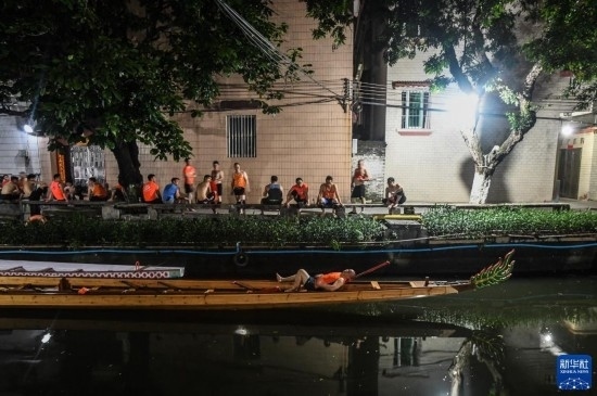 佛山疊滘東勝村的“扒仔”(槳手)在端午前堅持每天夜晚訓(xùn)練,以求能在端午龍船漂移賽中展示最佳狀態(tài)(6月16日攝)。