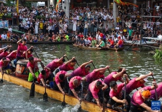 6月22日,“扒仔”(槳手)在佛山疊滘端午龍船漂移賽奮力揮槳,而舵手則穩(wěn)坐在船頭船尾。