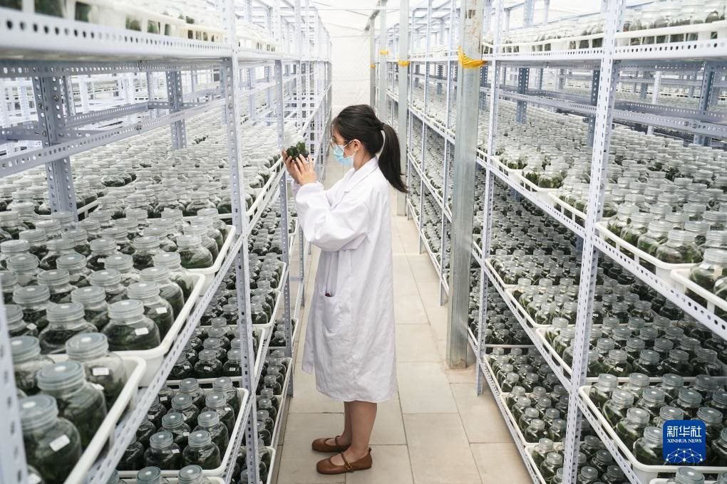 9月9日,技術(shù)人員在宿遷市王官集鎮(zhèn)蝴蝶蘭大世界查看瓶苗生長情況。