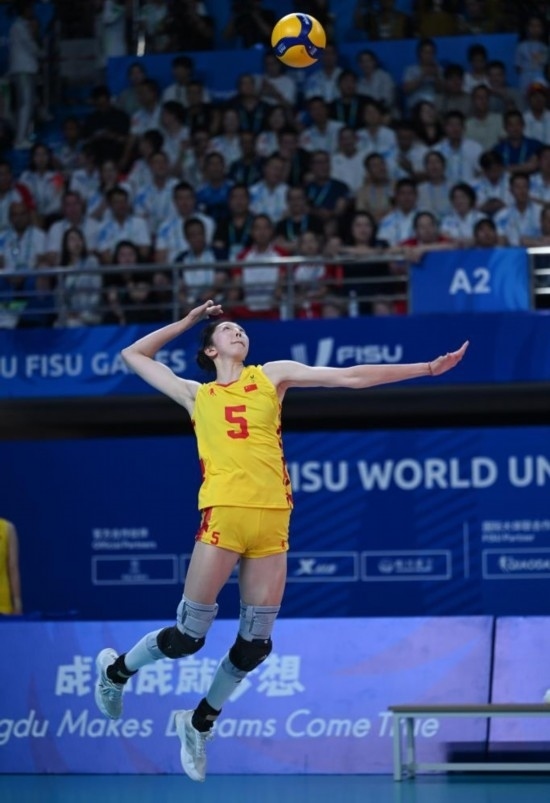 8月6日,吳夢(mèng)潔在第31屆世界大學(xué)生夏季運(yùn)動(dòng)會(huì)女子排球金牌賽中發(fā)球。新華社記者 胥冰潔 攝