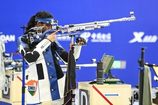 2023年7月29日,印度隊選手瓦拉里萬以252.5環(huán)的總成績獲得第31屆世界大學(xué)生夏季運動會女子10米氣步槍冠軍。新華社記者 曹祎銘 攝