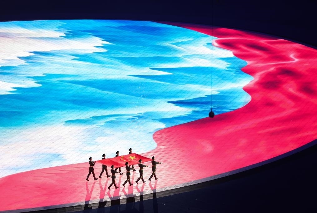 地屏上,一幅紅綢飛掠壯麗河山。8名儀仗兵步伐鏗鏘,護(hù)旗入場?!拔覑勰阒袊?,我愛你春天蓬勃的秧苗……”動(dòng)人的贊歌深情唱響。