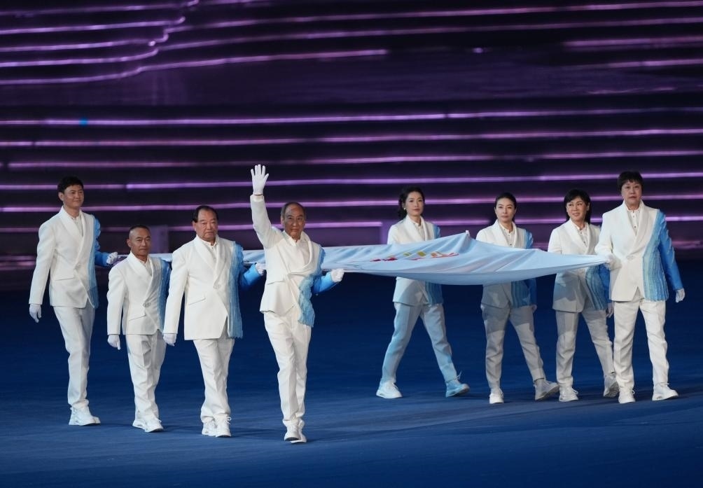 音樂響起,8名中國運(yùn)動(dòng)員、教練員代表共執(zhí)亞奧理事會(huì)會(huì)旗入場。伴隨著亞奧理事會(huì)會(huì)歌,會(huì)旗緩緩上升,在杭州高高飄揚(yáng)。