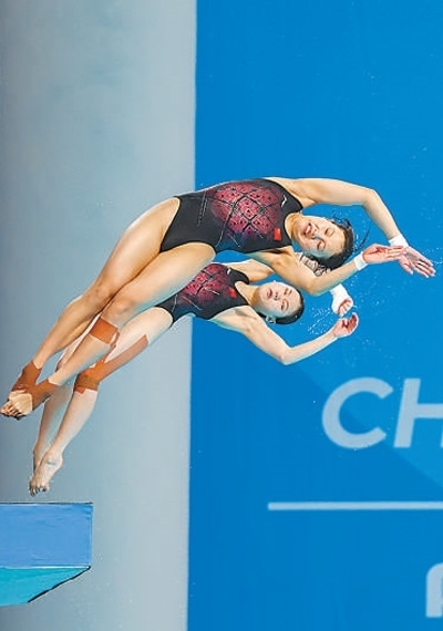 7月31日,中國代表團(tuán)選手張家齊(后)、掌敏潔在女子雙人10米跳臺決賽中。本報(bào)記者 伊 霄攝