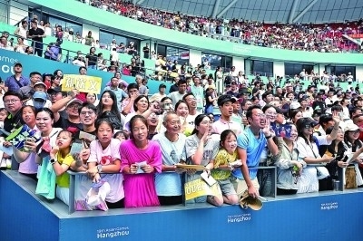 9月29日,杭州亞運(yùn)會(huì)網(wǎng)球女子單打決賽現(xiàn)場(chǎng),觀眾在歡呼。本報(bào)記者陳城攝 光明圖片