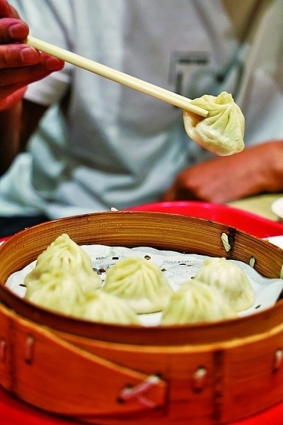 一名游客在吃杭州小籠包。本報(bào)記者 陳茵攝/光明圖片