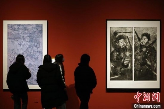 觀眾在江蘇省美術(shù)館展廳內(nèi)欣賞展出的版畫作品。 中新網(wǎng)記者 泱波 攝