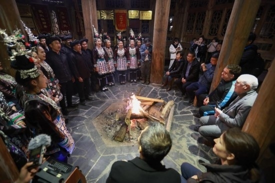 12月11日,榕江縣少數民族同胞用歌舞歡迎“學轉英超”培訓團隊。新華社記者 劉續(xù) 攝
